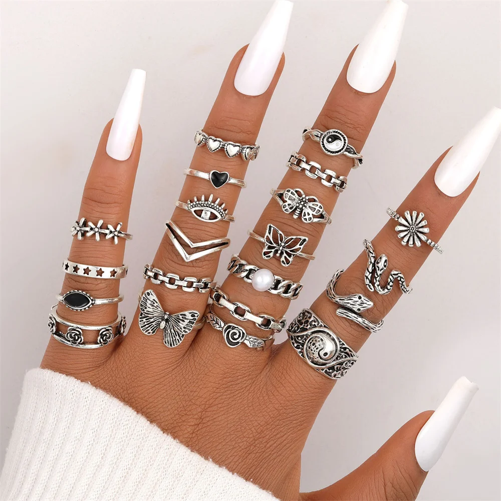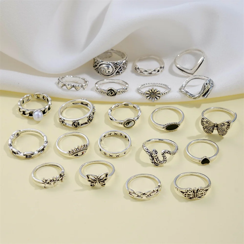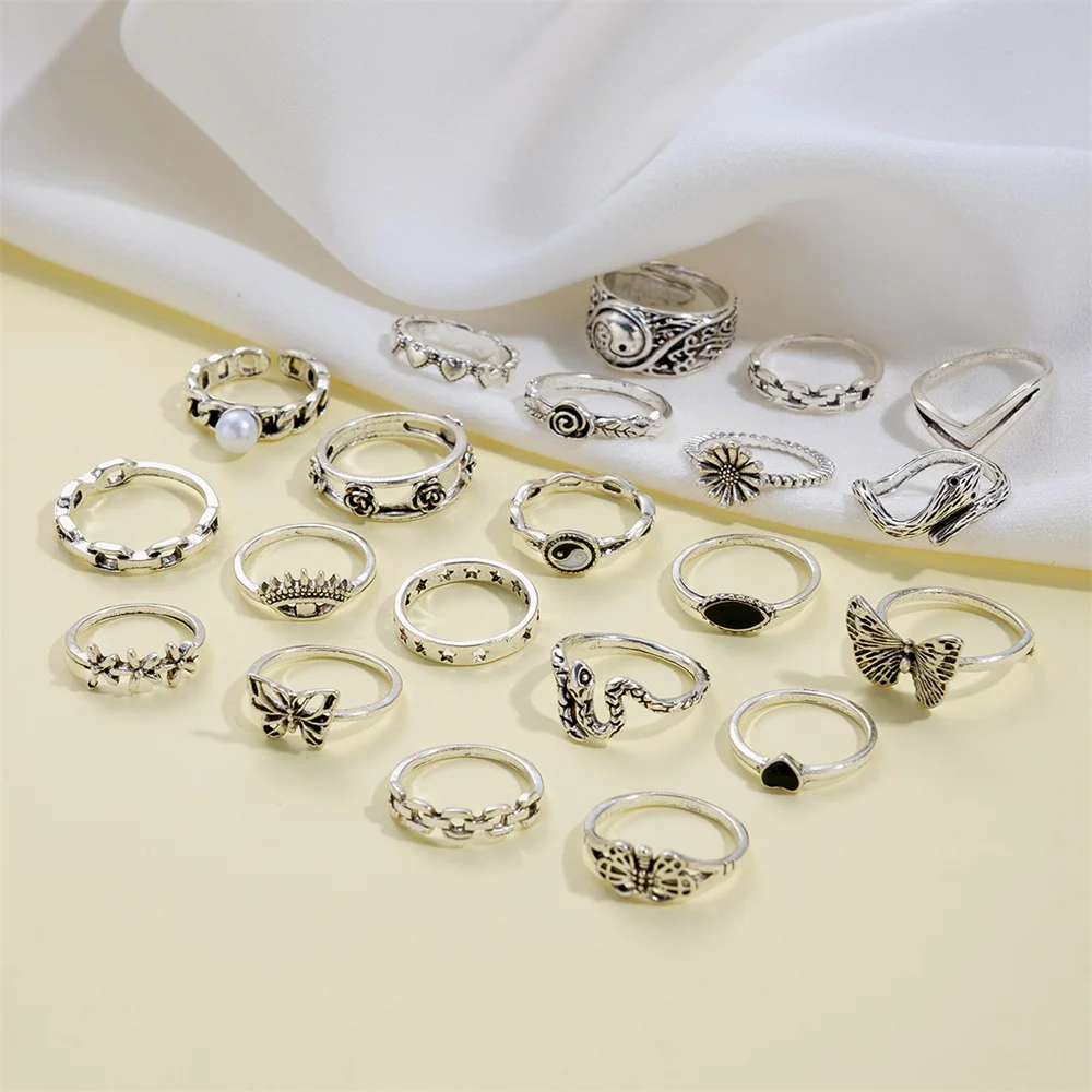 21pcs/set Punk Gothic Butterfly Snake Heart Rings Set For Women Men Vintage Silver Plated Geometric Finger Rings Party Jewelry